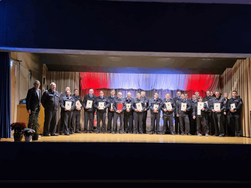 Im feierlichen Rahmen wurden mehrere Feuerwehrleute für ihre Verdienste ausgezeichnet und verdiente Beförderungen ausgesprochen. Mit Applaus und herzlichen Glückwünschen würdigten die Anwesenden das Engagement und die Leistungsbereitschaft der Geehrten.